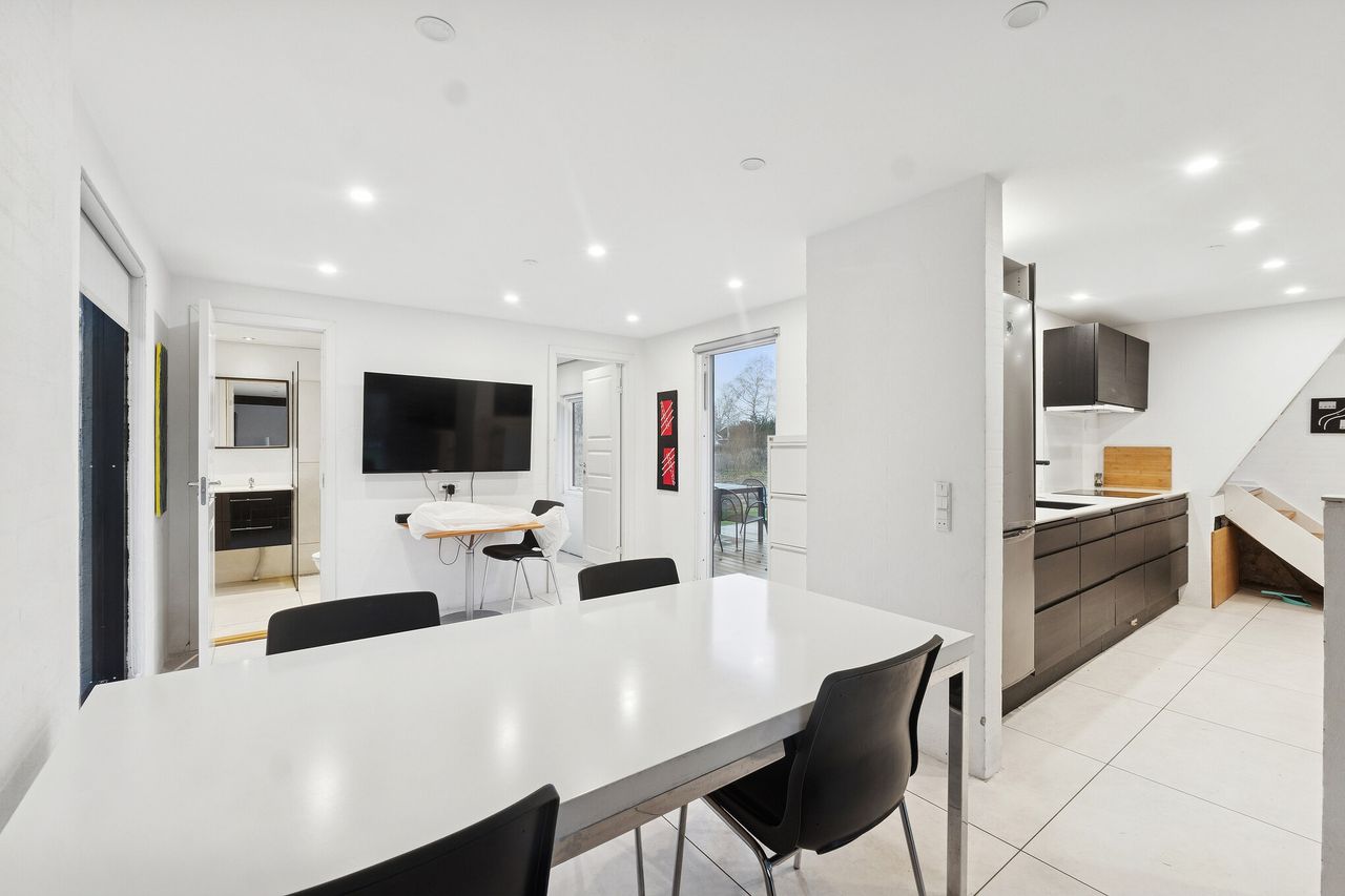 På første sal fortsætter den rummelige følelse med yderligere to værelser og en repos, der kan anvendes som kontor eller hyggekrog. Den nyligt installerede luft-til-vand varmepumpe bidrager til villaens energieffektivitet og reducerer de løbende omkostninger markant. Dvs. energimærket vil blive væsentligt forbedret.